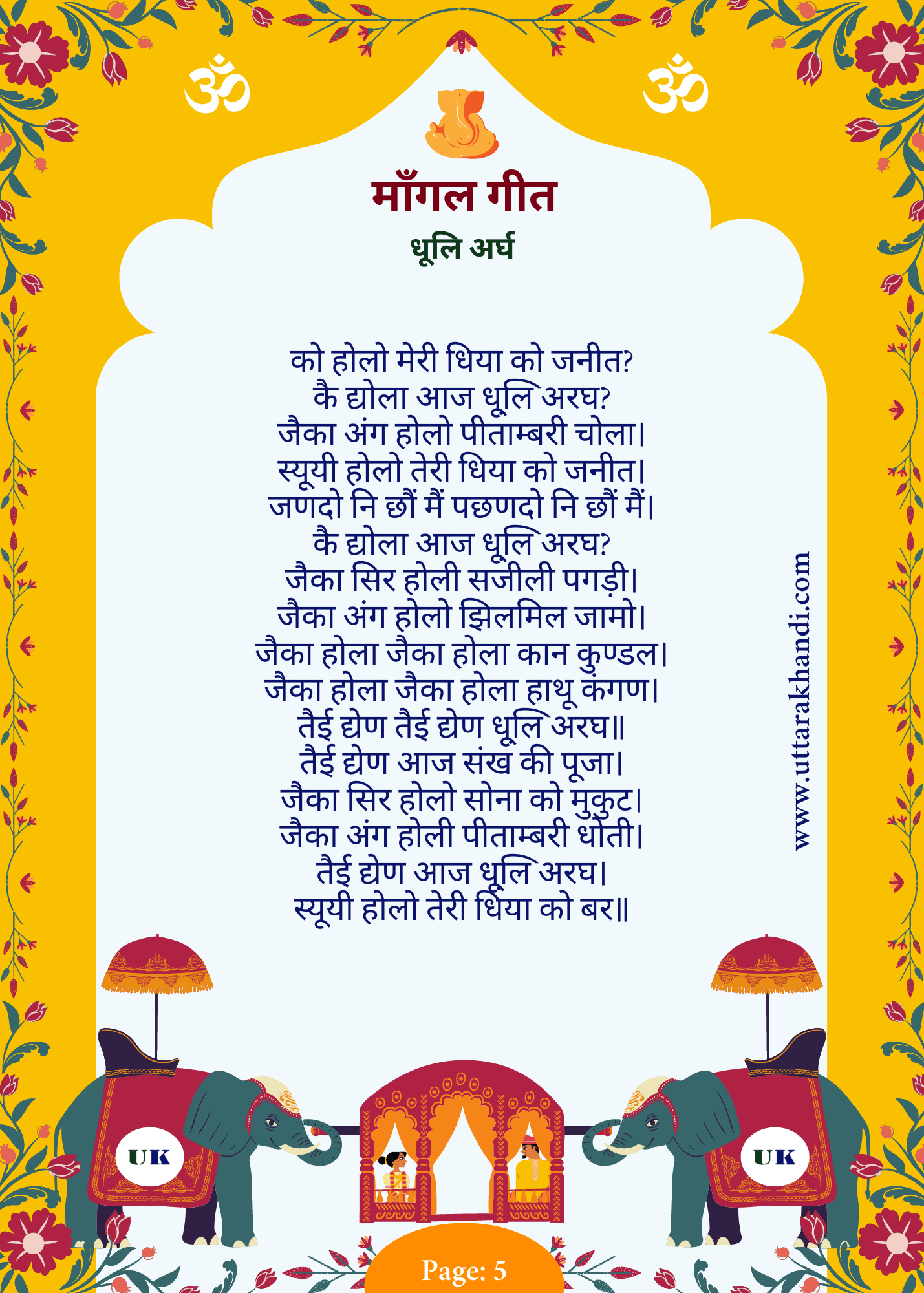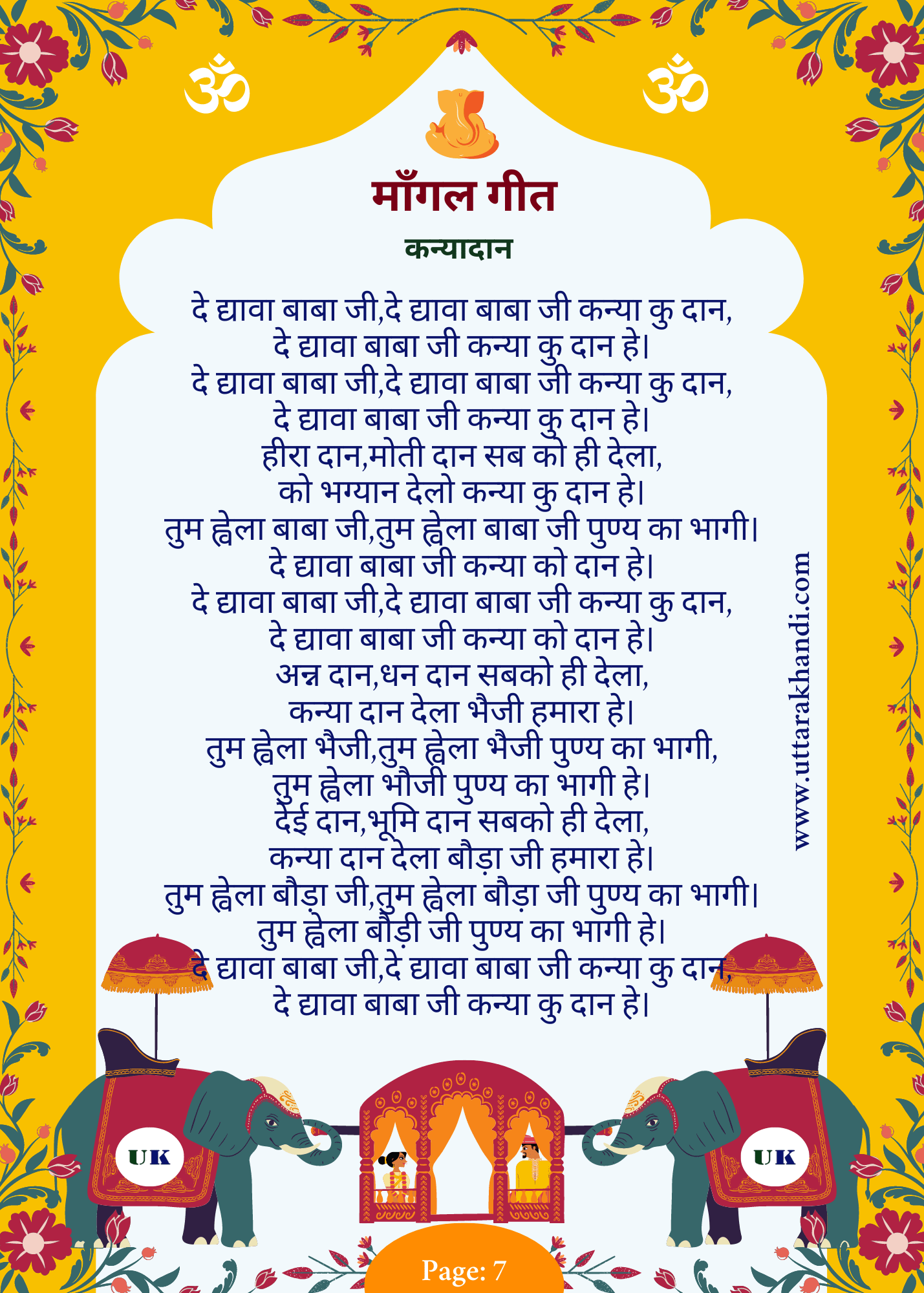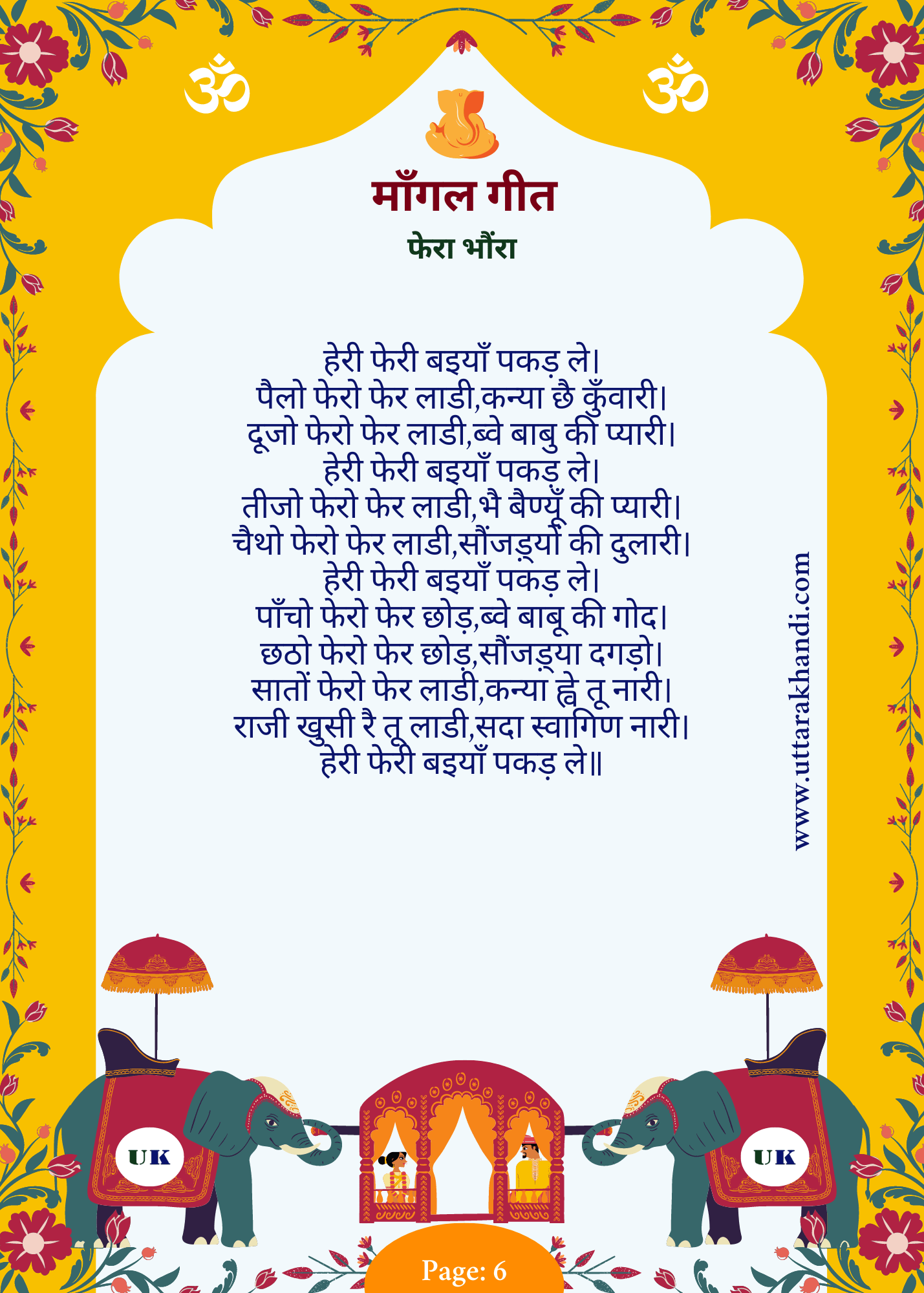 - “पाँचो फेरो फेर छोड़, ब्वे बाबू की गोद” (“In the fifth vow, O bride, you leave your father’s lap”) signifies the bride leaving her childhood behind.